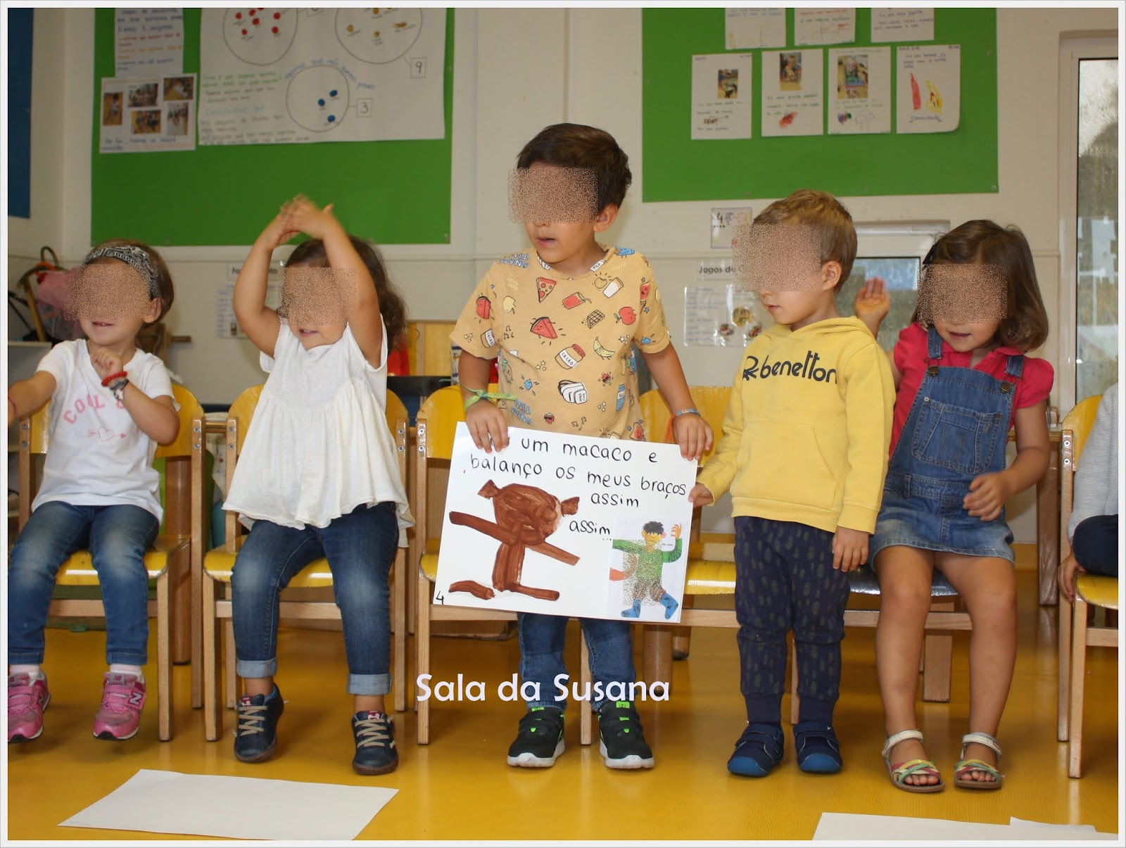 Para sabermos o que era um arco-íris e como é que ele se formava, a Sofia preparou-nos um teatro de sombras. Entretanto, soubemos que o grupo da sala da Marta Reis também estava curioso sobre esta questão, então convidámo-lo para se juntarem a nós.